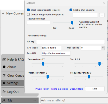 Advanced Settings: Customize the parameters of ChatGPT. See Advanced Settings for more details